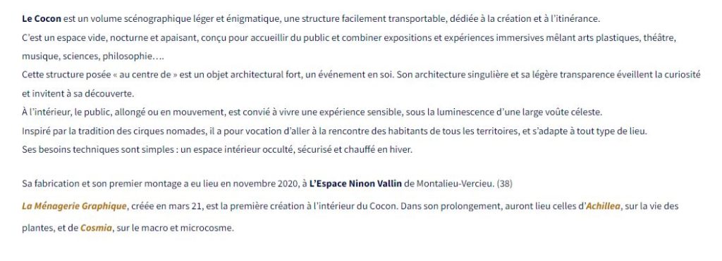 « le Cocon », une forme, une installation, salle Garnier, au cœur de l’école Garnier de Joigny, qui se construit et construit la magie de l’ailleurs, du ciel. Forme où une classe ou plus peut entrer dedans et découvrir « la ménagerie graphique » de dix artistes plasticiens et un montage-spectacle-présentation avec conteuse et musicien… et commence un travail arts plastiques de regardeur, d’écouteur.