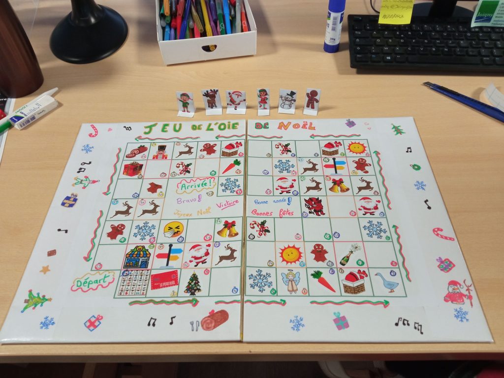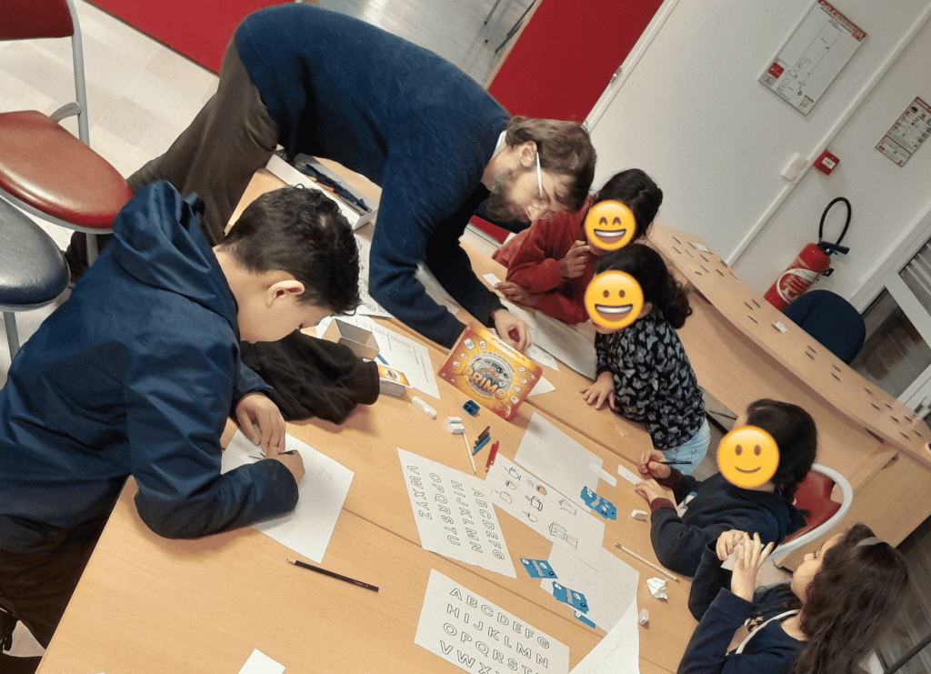 Une fois tous les deux mois, des participants peuvent venir fabriquer un jeu de société à la bibliothèque. Un jeu déjà existant que l’on peut reproduire tel quel, ou bien adapter, ou encore décliner dans d’autres univers, voire un jeu à concevoir de zéro. Soit on fabrique tous ensemble un jeu qui reste à disposition de tout le monde dans la bibliothèque, soit chaque enfant fabrique et ramène son propre jeu à la maison.