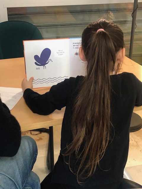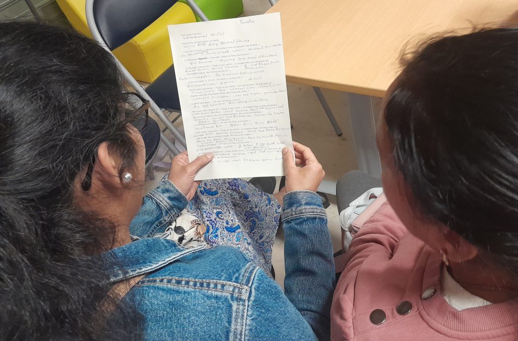 Au cours de la journée, les échanges se sont faits aussi bien en français qu’en anglais. Après une présentation de tous les participants, les familles se sont lancées dans la traduction littéraire du texte de l’album, du français vers leurs langues maternelles, en s’aidant autant que possible de la version anglaise du texte et de Mme Krempf, mais aussi de l’enseignante UPE2A Armelle Plot et du service civique Lucien Moreau, également présents. En fin de journée, des traductions en tamoul, en arabe littéral, en tchèque, en kinya et en espagnol vénézuelien ont été faites. L’après-midi s’est terminé par des jeux autour des langues et du livre plurilingue : le jeu du téléphone et le domino des livres.