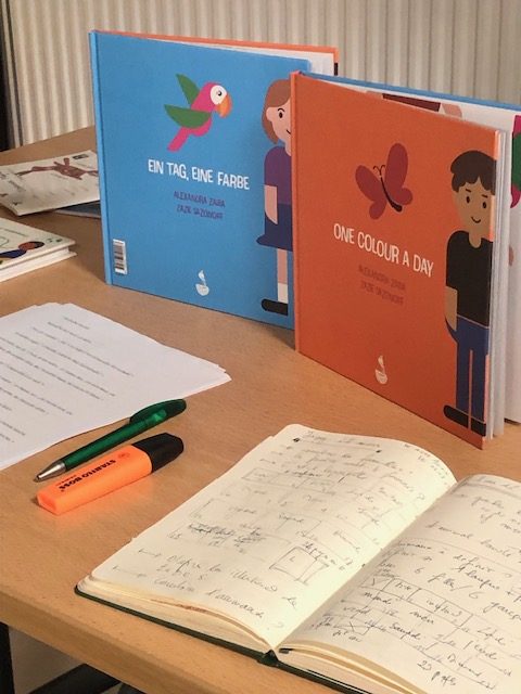 En mai 2024, les éditions Migrilude, spécialistes du multilinguisme, publient un album jeunesse bilingue en anglais – allemand : One colour a day – Ein Tag eine Farbe. Ecrit et illustré par deux artistes bourguignonnes, Alexandra Zaba et Zazie Sazonoff, cet album riche, conçu comme une ritournelle, invite à s’approprier le lexique de la vie quotidienne en langues anglaise et allemande.